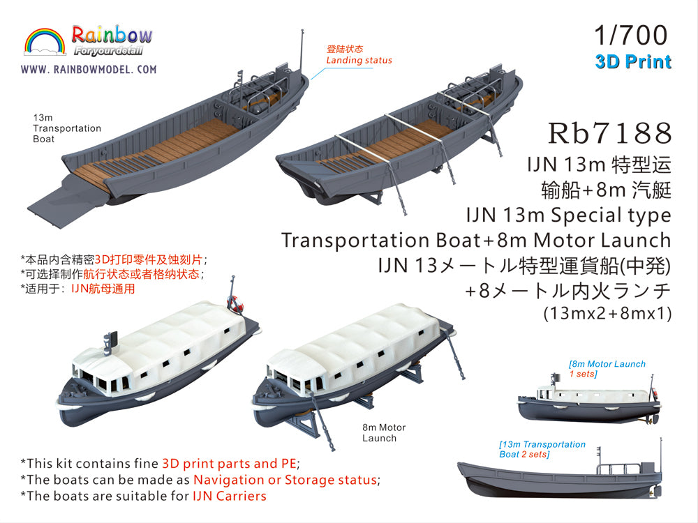 Rainbow RB7188 1/700Detail Up IJN 13m Transportation Boat+8m Motor Launch [13m*2+8m*1|3DP+PE]